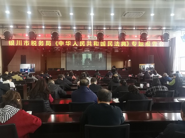 为深入学习贯彻落实民法典,大力加强机关党的政治建设,进一步推动模范机关创建,10月20日下午,银川市税务局邀请宁夏大学政法学院教授朱爱农以《中华人民共和国民法典》为主题进行专题辅导报告会。市局党委委员、机关全体干部在主会场参加会议,各县级局及派出机构全体干部在各分会场参加会议。