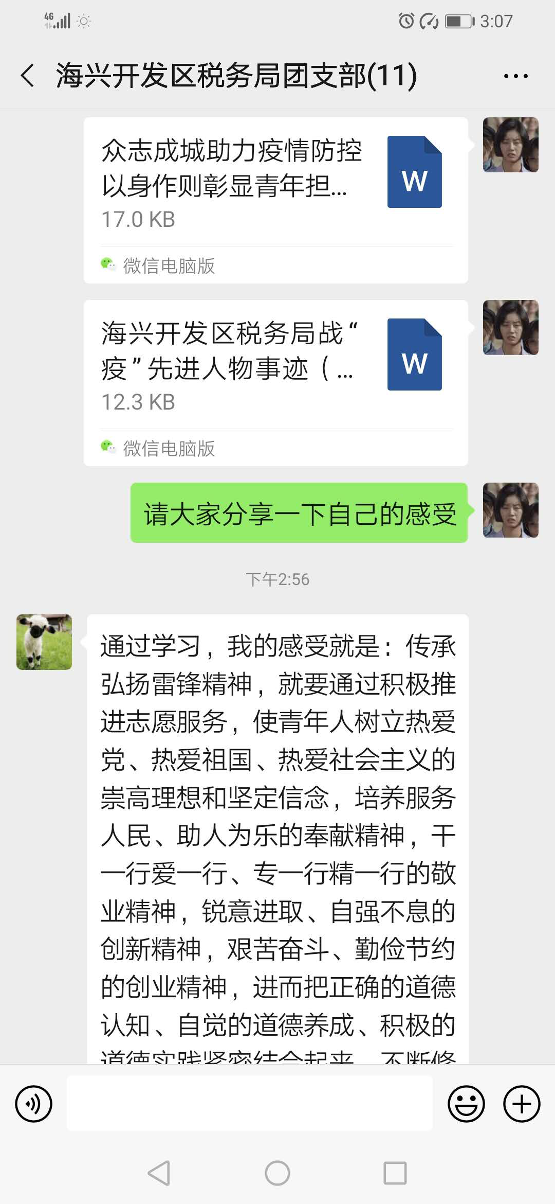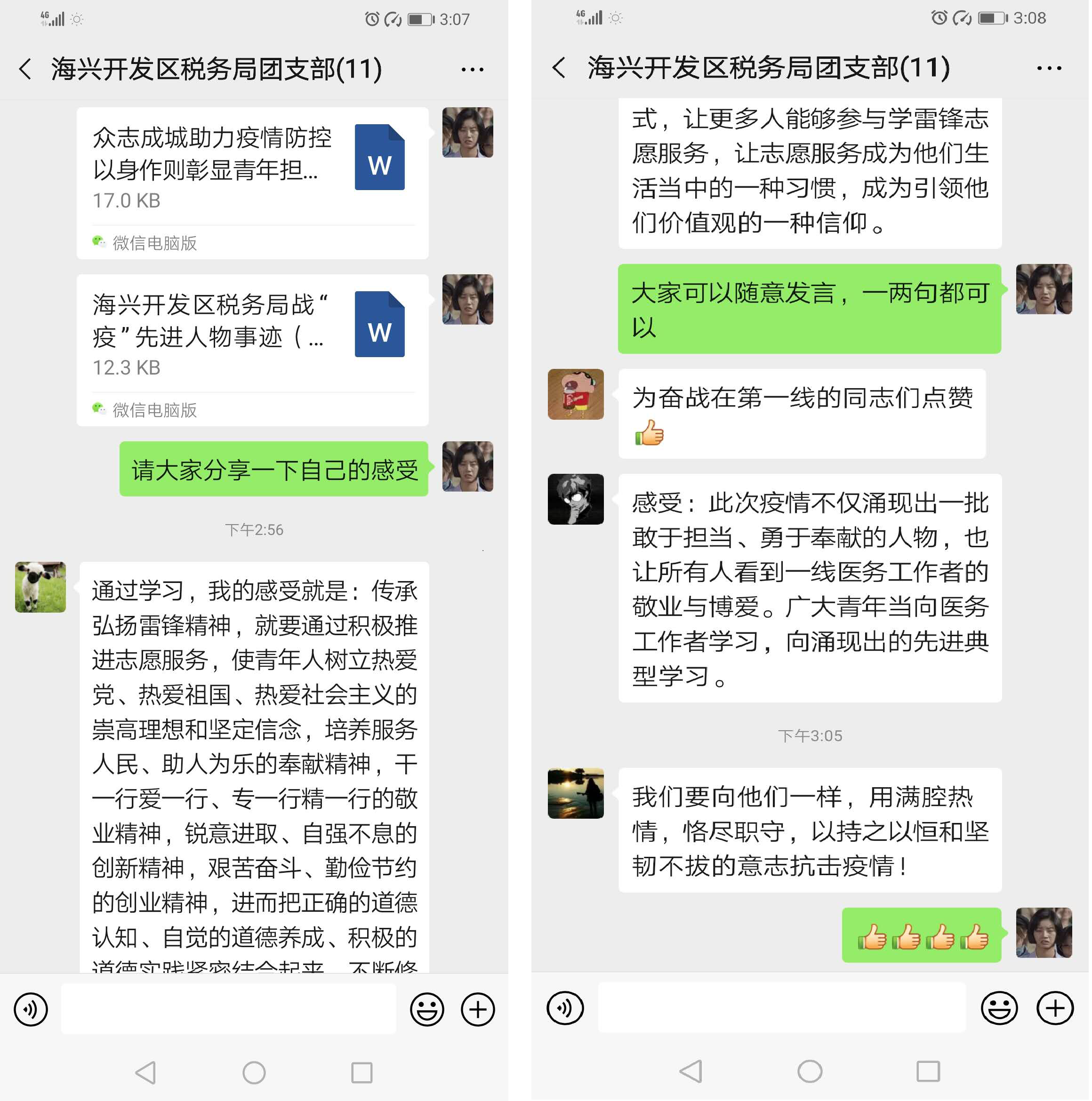 疫情来势汹汹,每个人都不能掉以轻心。新冠肺炎疫情发生以来,海兴开发区税务局多次通过微信工作群、学习强国、获得平台等方式传达税务系统和地方党委政府关于疫情防控工作的重要指示精神,并转发中卫市团委给广大团员青年的一封信,号召全体团员万众一心、众志成城,坚决打赢疫情防控阻击战。大家纷纷表示,作为年青一代,在国家和社会需要我们的时候,我们就应该义不容辞地挺身而出,用实际行动展现税务人的责任和担当。