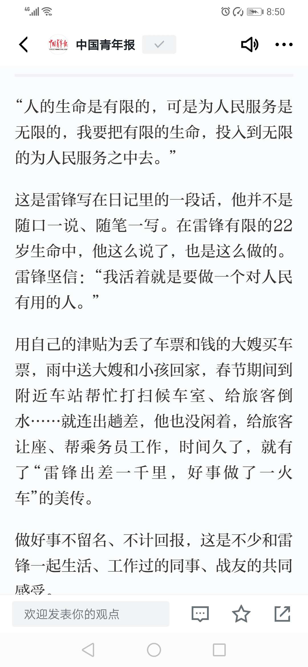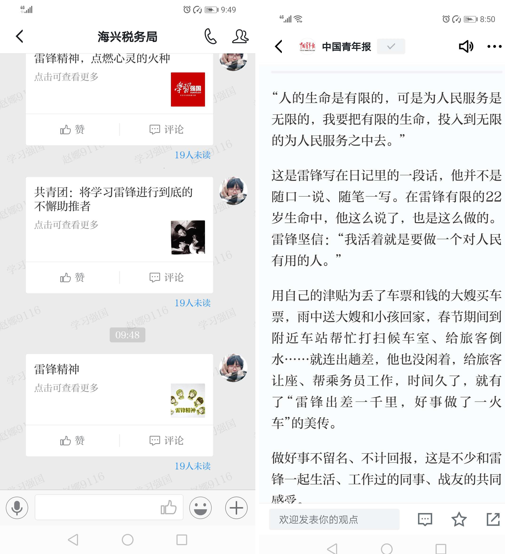“人的生命是有限的,可是为人民服务是无限的,我要把有限的生命,投入到无限的为人民服务中去。”这是雷锋写在日记里的一段话。3月4日早上,团总支将一篇《将学习雷锋进行到底的不懈助推者》文章通过学习强国平台推送至海兴税务局工作群,使全体干部特别是青年干部深入了解雷锋,更深切地明白,为什么雷锋离开这么久,他的榜样力量从未衰减,为什么雷锋精神的感召力始终镌刻在人们心中。学习雷锋,可以让我们收获更好的自己,在人人有爱的簇拥下让社会更有温度、在人人奉献的众志成城里让国家更有力量。