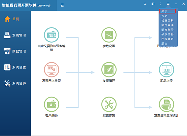 图标,显示帮助主体菜单,点击“关于”可查看主要显示纳税人基本信息、版权信息、开票系统版本信息等。