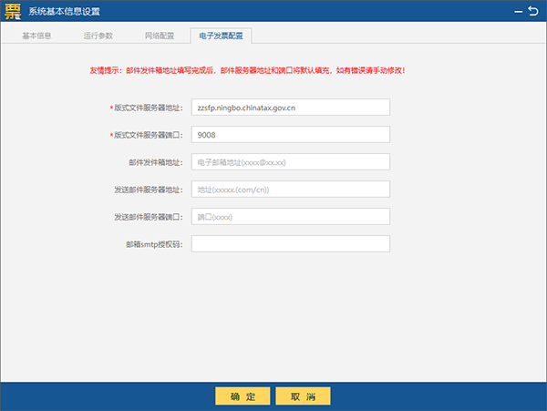 答:首次开具增值税电子专用发票之前,需要进行参数配置,包括版式文件服务器地址、版式文件服务器端口、邮件发件箱地址、发送邮件服务器地址、发送邮件服务器端口和邮箱SMTP授权码。依次点击“系统设置-系统基本信息设置-电子发票配置”,软件自动带出版式文件服务器地址,版式文件服务器端口。