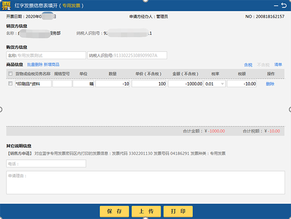 销售方申请填开红字信息表。需填写蓝字发票代码和号码,选择发票填开日期,点击下一步,如果数据库中有对应蓝字发票,进入信息表填开界面,系统会自动填写信息表信息;数据库中无对应蓝字发票信息的,销方信息自动带出不可修改,其他信息需要进行手工填写,确认无误,点击上传。