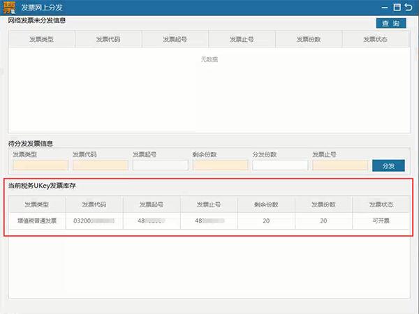 答:进入税务UKey标签页,显示当前纳税人的网上发票及税务UKey中可用发票库存信息。点击“查询”按钮,查出纳税人所有的未分发的和待分发的网络发票,同时显示税务UKey中的发票库存信息。在网络发票未分发信息查询结果中选择想要分发的发票,在待分发发票信息框中输入想分发的份数(不能超过剩余份数,且分发份数不能为零),点击“分发”按钮,分发成功后,软件自动查询显示发票已分发至当前税务UKey中,发票状态为可开票,说明发票可正常使用。