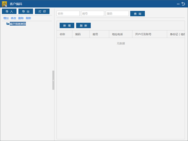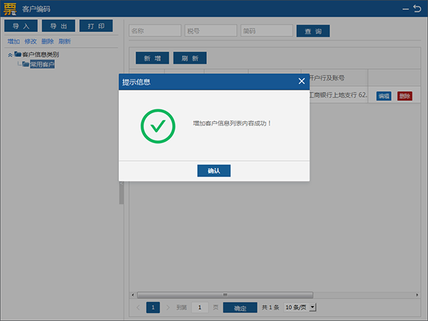 点击“确认”完成客户信息新增。这样开票时可直接选取使用该客户信息。同时客户编码模块也提供导入,导出和打印功能。见图18。支持导入金税盘、税控盘中购买方企业信息。