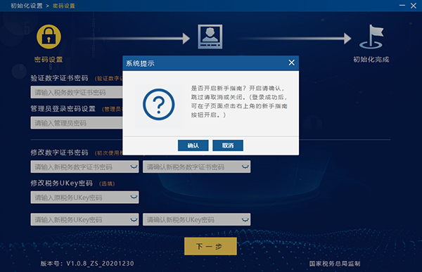 新手指引,根据初始界面提示框设置新手指引功能,见图5。点击“确认”按钮开始新手指引,纳税人可根据指引进行操作。点击“取消”按钮或关闭提示框可关闭新手指引。进入软件之后纳税人可到相关界面点击右上角的“新手指南”按钮进入新手指引界面。