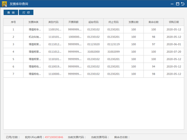 1、发票库存查询:用于查询税务UKey中可用的各段发票的库存信息,以方便用户掌握发票期末库存情况。见图26。