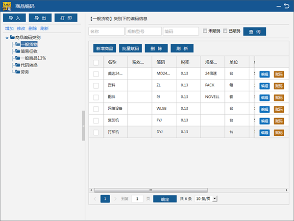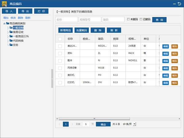如需批量赋码,可勾选多个需要赋码的同类商品,点击批量赋码按钮,赋码完成即可。商品编码模块也提供导入,导出和打印功能。