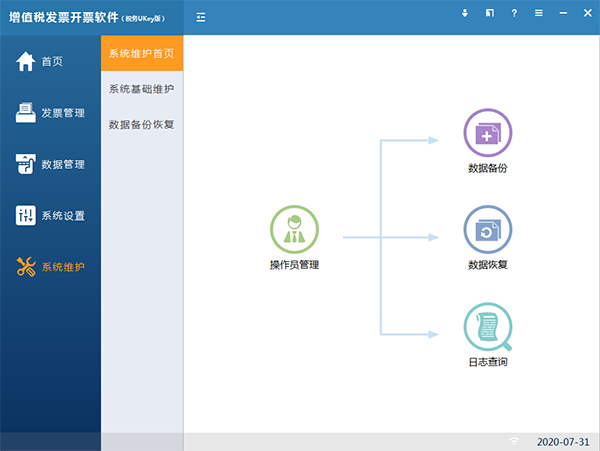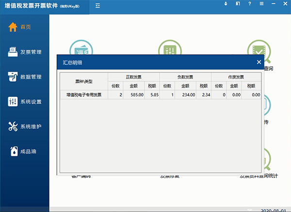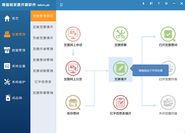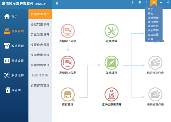 软件主要包括“首页、发票管理、数据管理、系统设置、系统维护、成品油模块(成品油企业可见)”。见图9。首页主要展示常用的功能模块,提供快捷入口。