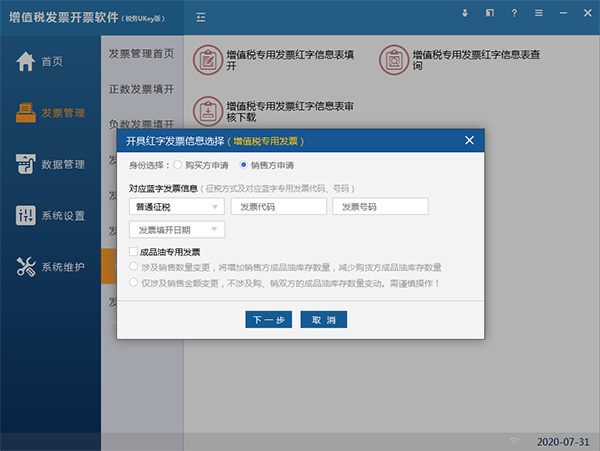 销售方申请填开红字信息表。需填写蓝字发票代码和号码,选择发票填开日期,点击“下一步”。见图44。如果数据库中有对应蓝字发票,进入信息表填开界面,系统会自动填写信息表信息;数据库中无对应蓝字发票信息的,销售方信息自动带出不可修改,其他信息需要进行手工填写,确认无误,点击上传。