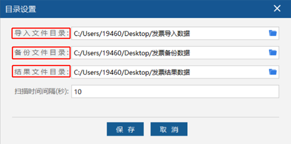 首次开具需进行目录设置,指定发票文件存放目录。见图31。“扫描时间间隔(秒)”用来设置读取每个文件的间隔时间,用户可根据需要自行设置。