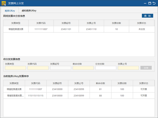 3、发票网上分发:用于将企业已领取但是未分发的发票写到税务UKey。