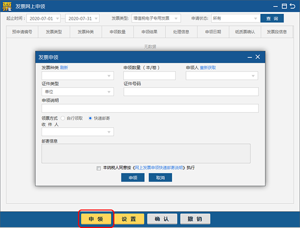 2、发票网上申领:用于通过网络进行发票的领购申请。此模块可进行发票申领结果查询、新增申领请求、设置纳税人发票配送地址等。