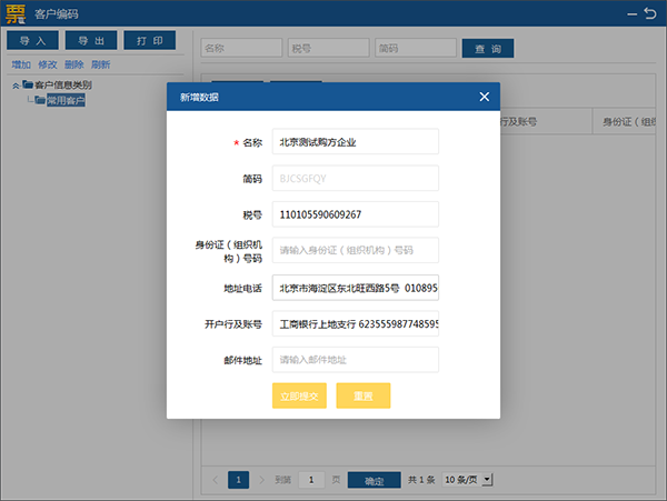 选中该类别后,点击右侧“新增”按钮,填写购买方客户名称、税号、地址电话、开户行及账号等信息,点击“立即提交”。见图16。