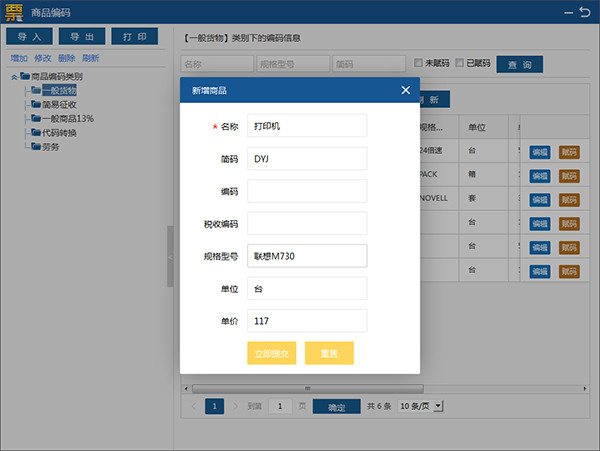 左侧选择一个商品编码类别,右侧点击新增商品按钮。在新增商品输入框中输入名称,自动生成简码,继续输入规格型号、单位、单价,点击立即提交。见图20。