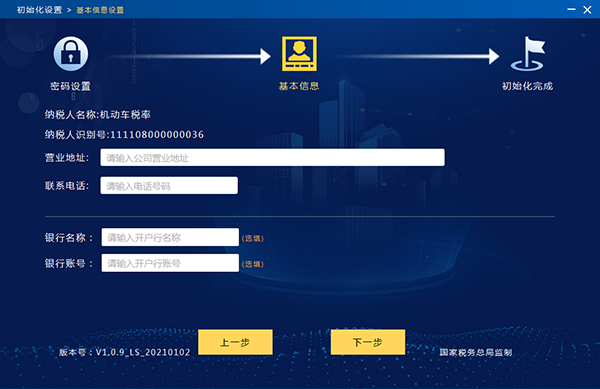 设置企业基本信息,依次填入营业地址、联系电话、银行名称、银行账号,点击下一步。见图7。