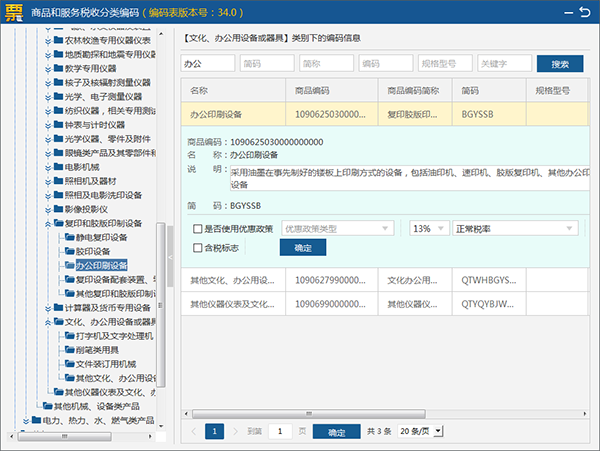 在弹出的商品和税收分类编码表中选择准确的编码,或者通过查询搜索来选择要赋的商品编码。勾选是否使用优惠政策,确认税率,是否含税标志后,就可以确认提交了。见图22。