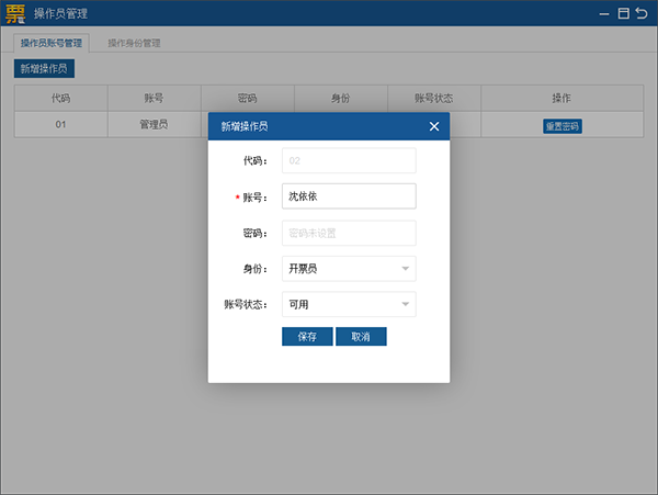 点击“新增操作员”按钮。账号位置输入开票员姓名,密码默认不设置,如需要可在此设置,身份默认开票员,账号状态可用,点击保存,新增成功。见图12。