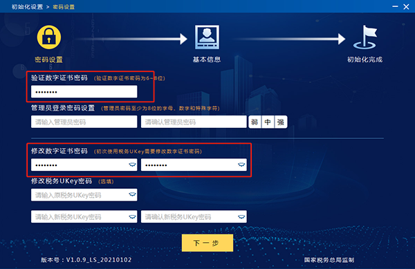 密码设置,在“验证数字证书密码”处输入初始密码8个8,首次使用税务UKey时需要修改数字证书密码,即在“修改数字证书密码”处两次输入新的证书密码。“管理员登录密码”默认为空,管理员可自行选择是否设置,设置时需两次输入符合要求的密码。“修改税务UKey”密码为选填项,需要修改税务UKey密码的,需要按照提示输入原税务UKey密码,再两次输入新的税务UKey密码,点击下一步。见图6。