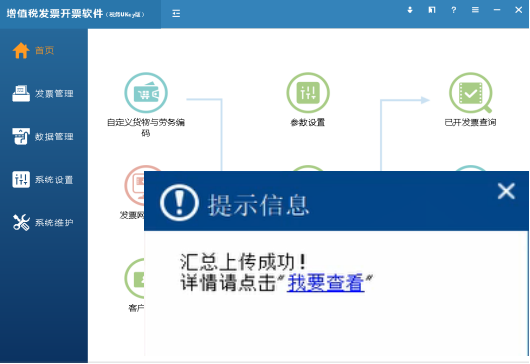 在增值税申报期内,纳税人可在连接互联网后登录开票软件进行发票汇总上传操作,软件支持登录后自动汇总上传,汇总上传成功后会在开票软件界面右下方弹窗提示汇总信息,见图48。点击“我要查看”,可查看汇总上传明细信息,见图49。