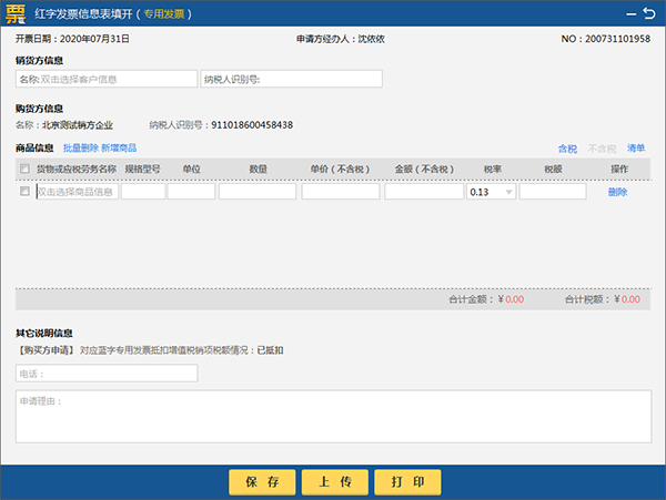购买方填开红字信息表。根据对应蓝字专用发票抵扣增值税销项税额情况,分已抵扣和未抵扣两种方式:选择已抵扣,不需要填写对应蓝字发票代码和发票号码,直接点击“下一步”。选择未抵扣,需填写蓝字发票代码和号码,选择发票填开日期,点击“下一步”,进入填开界面,购买方信息自动带出不可修改,其他信息根据原蓝字发票进行填写,确认无误,点击“上传”。见图39。