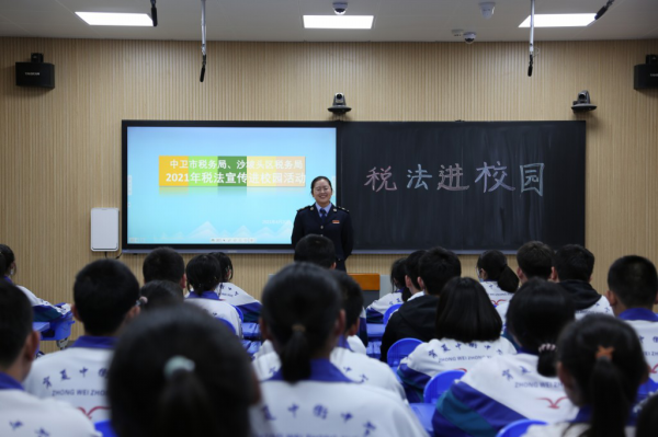 4月20日,中卫市税务局紧密结合“便民办税春风行动”,乘税收宣传月东风,联合沙坡头区税务局、中卫中学共同开展了以“青春‘税’月,与法同行”为主题的“税法进校园”活动,为中卫中学高一年级同学送上了精彩纷呈的税收宣传“大餐”。