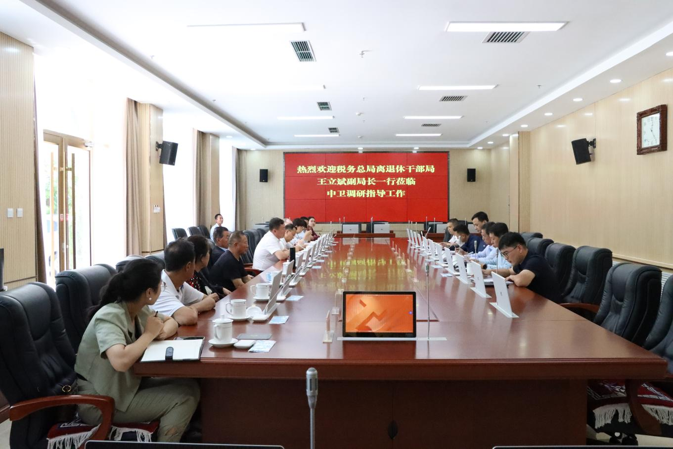 9月1日上午,国家税务总局离退休干部局王立斌副局长一行3人,在宁夏区税务局一级巡视员韩振平、老干部处处长马东波的陪同下莅临中卫市税务局,实地调研指导工作。中卫市委离退休干部党工委书记、市委老干部局局长吴金柱应邀出席会议。