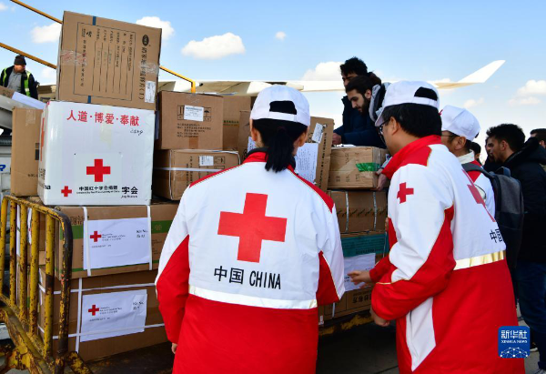 工作人员在叙利亚大马士革国际机场卸载中国红十字会援助的人道主义物资(2023年2月13日摄)。新华社发(阿马尔·萨法尔贾拉尼摄)