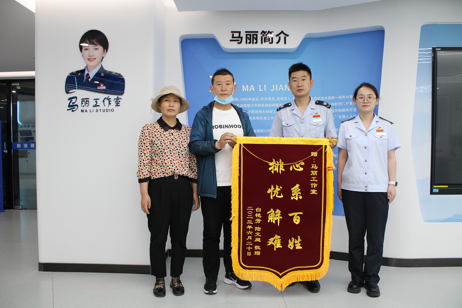 近日,在银川市金凤区税务局办税服务厅内,陆先生等两位纳税人将一面写着“心系百姓,排忧解难”的锦旗送到了马丽工作室的成员手中,对他们积极主动为纳税人解决复杂问题的过程中提供的优质、高校、便捷、热情的服务表示感谢。