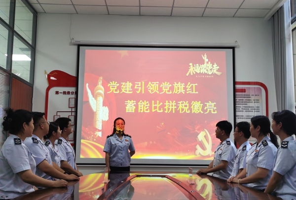 “学”字为先, 以“充电小课堂”增强电量。通过晨会夕课、“三会一课”、党员大会等平台,组织全员学习习近平新时代中国特色社会主义思想、习近平总书记系列重要讲话和重要指示批示精神,下发干部应知应会小册子和“青廉税务”内刊,将党建知识、政治机关建设、廉洁从政相关知识学在日常,进一步提高全员的政治素养,筑牢廉洁防线。将窗口人员按照岗位职责进行业务分组,实现办税服务厅工作人员全覆盖,以提高业务服务水平为出发点,按照每周一组一人轮流授课答疑的方式进行讲课“充电”,采取PPT讲解、快问快答、模拟实操等方式,对全员进行精准“靶向充电”,内容涵盖日常实操中的疑难点和易错点,同时延伸至相关政策法规的解读,切实达到“查漏补缺、有错必改、互鉴互补”的效果。