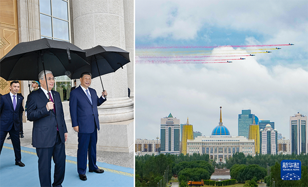习近平乘车抵达总统府时,托卡耶夫总统热情迎接。六架哈萨克斯坦空军战机从总统府上空飞过,拉出象征中国国旗的红黄色彩烟,以最高礼仪欢迎习近平对哈萨克斯坦进行国事访问。