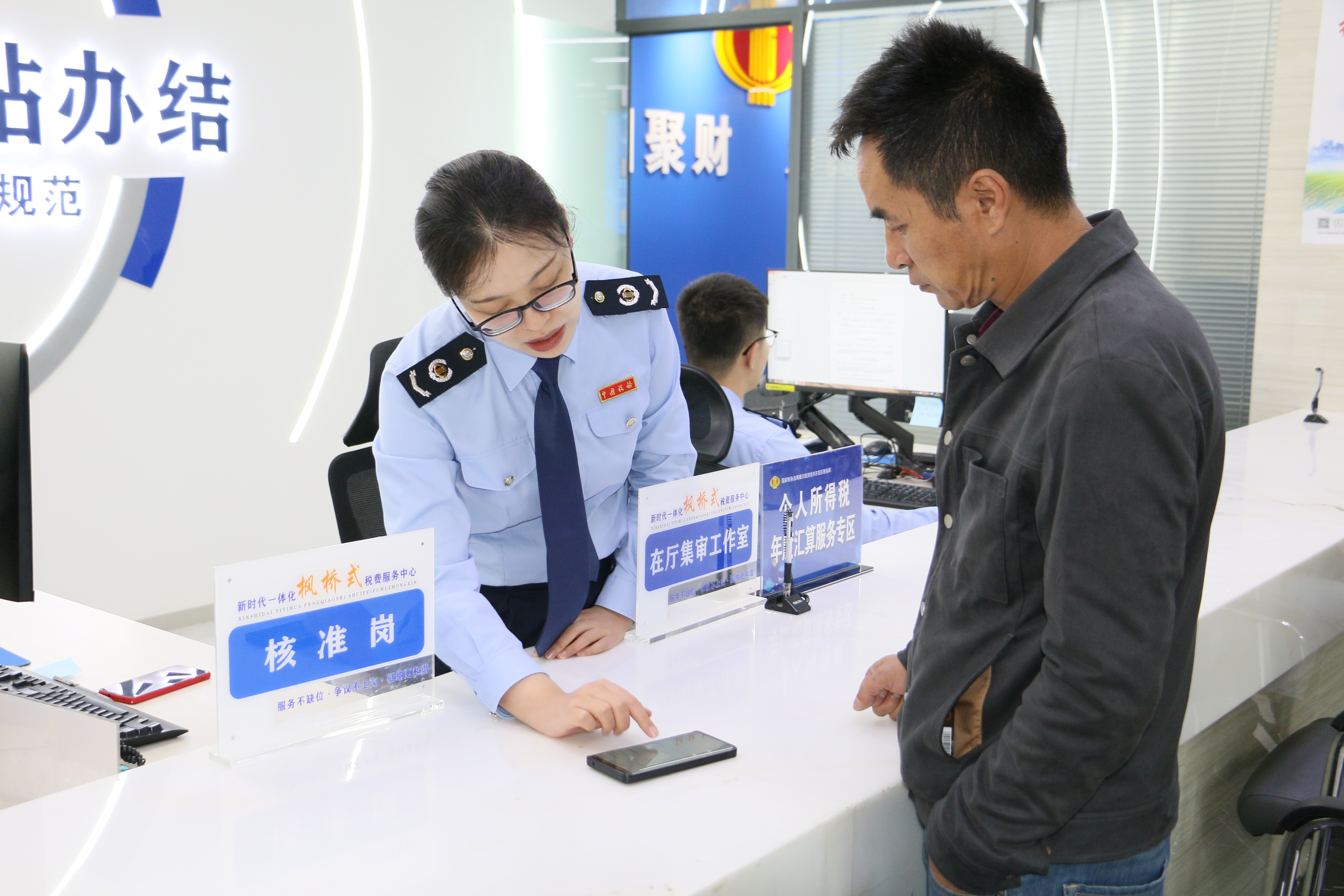 在厅集审工作室工作人员手把手指导服务办税群众,讲解办税流程。