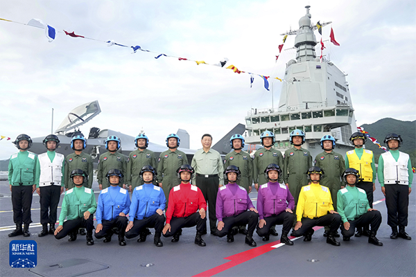 11月5日,我国第一艘电磁弹射型航空母舰福建舰入列授旗仪式在海南三亚某军港举行。中共中央总书记、国家主席、中央军委主席习近平出席入列授旗仪式并登舰视察。这是习近平同舰载机飞行员、航空保障人员合影留念。新华社记者 李刚 摄